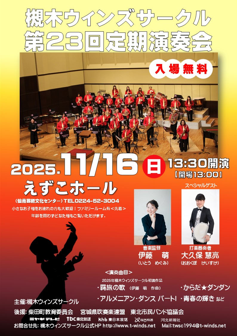 第23回定期演奏会を11/16(日)大河原町のえずこホールで行います。今年はスペシャルゲストとして、なんと地元槻木出身の打楽器奏者 大久保 慧亮さんをお呼びします。 入場無料です。当日は、吹奏楽のオリジナル曲や大人も子どもも楽しめる曲をたくさんご用意しています。聴くだけじゃなく、見ても楽しい演奏になること間違いなしです。子育て中のパパさんママさん、2〜3歳のお子さんや未就学児も大歓迎。楽しめます。お時間があれば、ぜひお越しください!